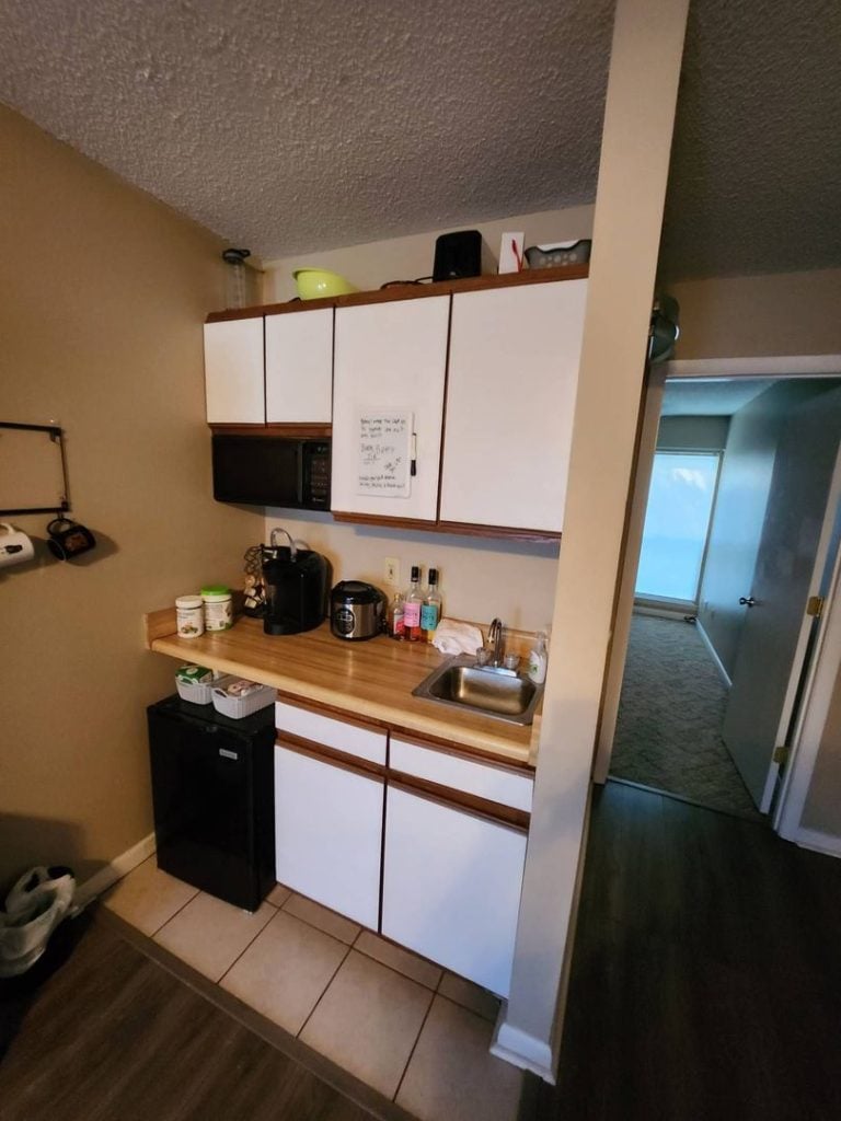 – Two bedrooms, a bathroom, mini kitchen, living room & patio/balcony on each level.