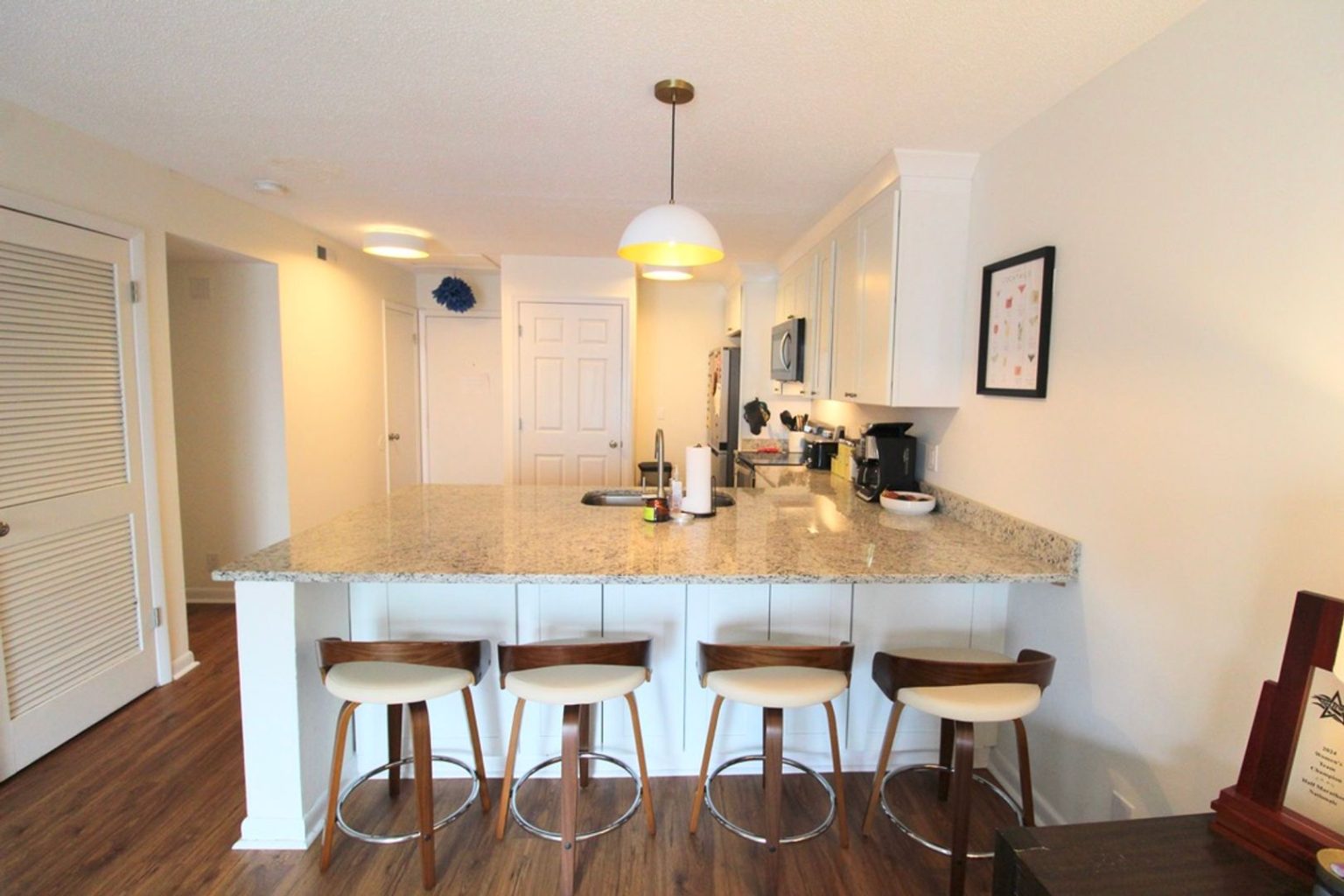 Top-floor furnished 4-bedroom condo with electric and water included with generous caps. This condo is completely remodeled with an enlarged kitchen, luxury vinyl plank flooring, upgraded furniture and more. Secure your spot now before it’s gone!
