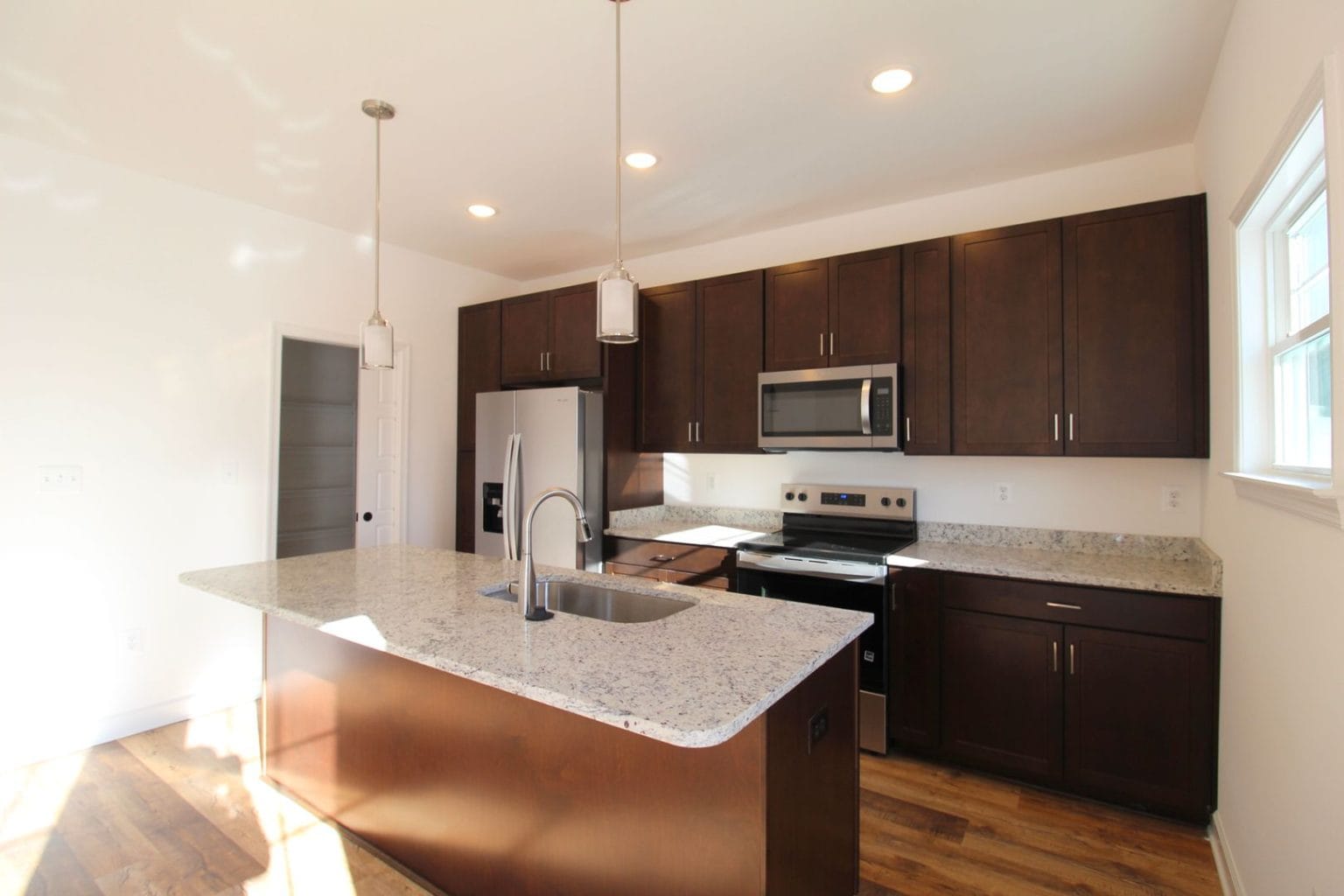 The main living level features nine-foot ceilings, luxury vinyl plank flooring, and a bright, open living area. The kitchen is designed for both everyday living and entertaining, offering granite countertops, shaker-style cabinetry, stainless steel appliances, a large center island, and an oversized walk-in pantry.