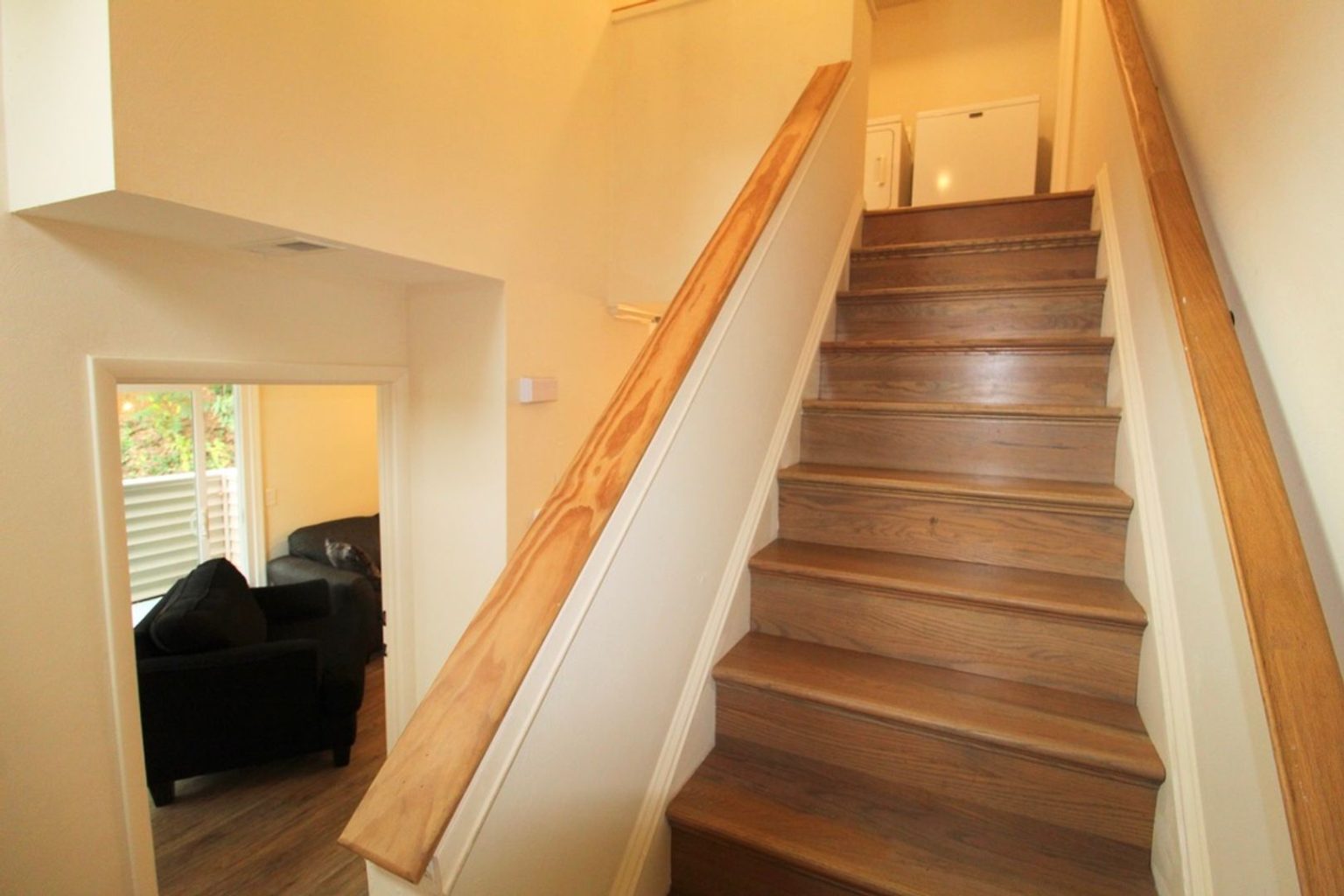 Full kitchen, living room, 2 bedrooms, 1 bathroom, and your own private balcony—per floor! Laundry is shared between the two levels, but you’ve got plenty of space to spread out.