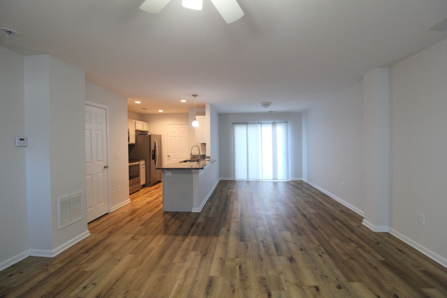 This growing neighborhood offers a convenient location with a welcoming community feel. The open-concept main level features a spacious living area that flows seamlessly into a modern kitchen with stainless steel appliances and granite countertops, along with Luxury Vinyl Plank flooring throughout the first floor. Upstairs, the primary suite offers a large walk-in closet, double sinks in the master bathroom, and plenty of room to relax. The home also includes a private patio perfect for entertaining or enjoying quiet evenings, assigned parking spots for added convenience, and access to a community common area/green space. All appliances are included, making this property truly move-in ready.